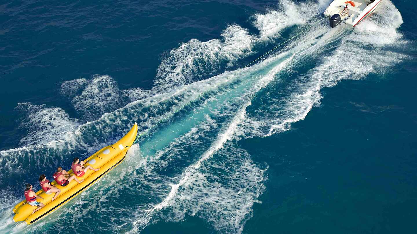Unsere Clubs in erster Strandlage sind wie gemacht für die schwimmenden Bananen auf dem Wasser. Gut Festhalten und schon geht’s los! Lass dich auf dem Banana Boat von einem Motorboot übers Meer ziehen, hüpfe über die Wellen und trotze den Naturgewalten. Eine einzigartige Erfahrung, die auf der “Banane” Fremde zu Freunden werden lässt. Probiere es einfach mal aus!