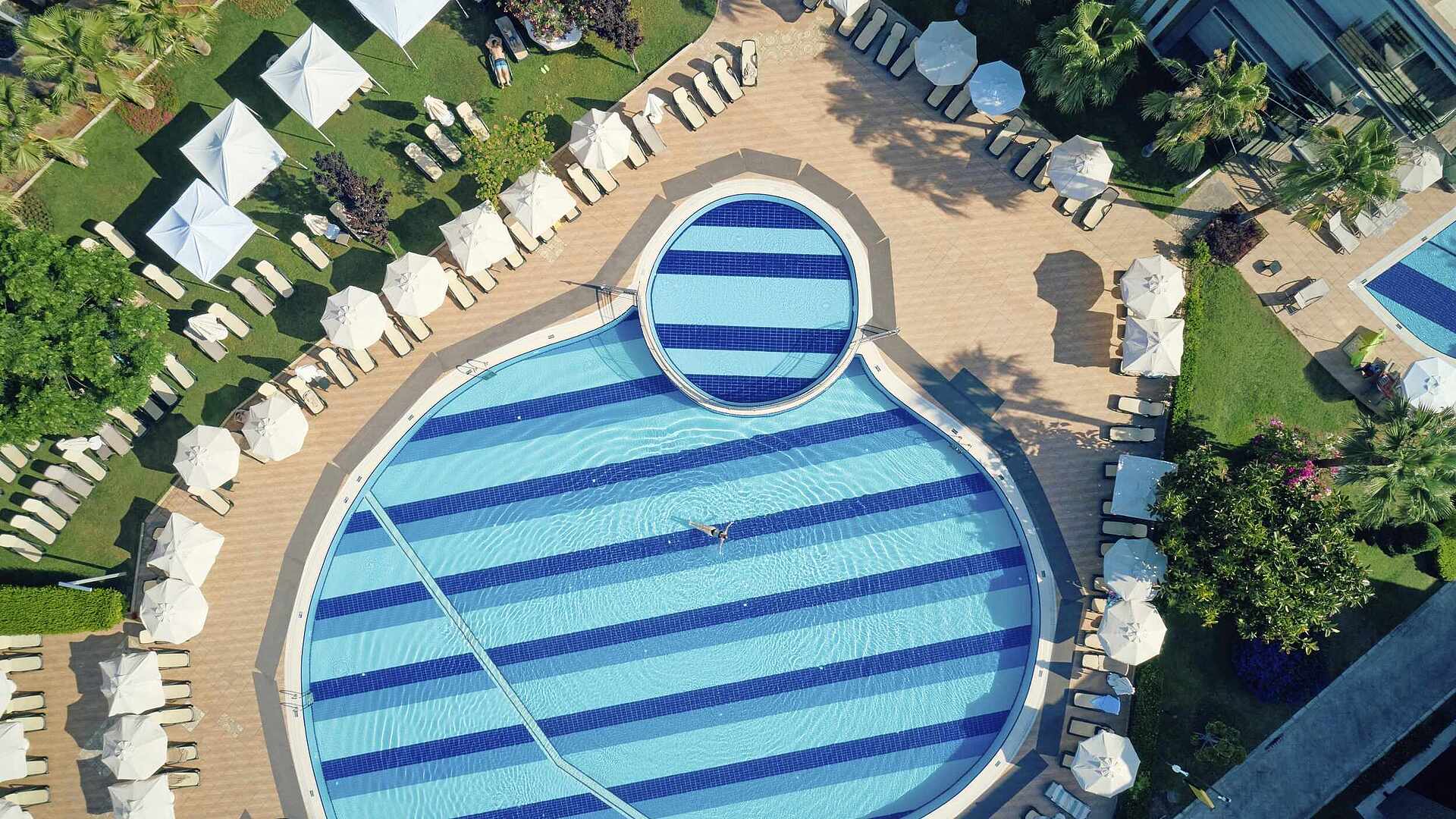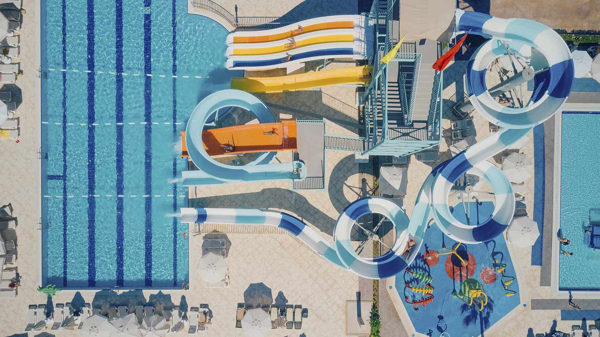 The pool complex offers 10 different pools, an indoor pool, a water park and 5 water slides.